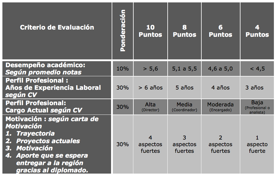 Los postulantes serán evaluados según los siguientes criterios de evaluación: